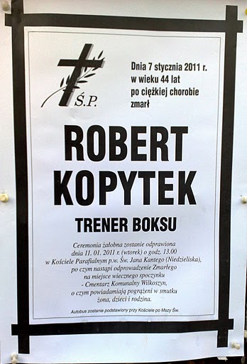 Spoczywaj w pokoju Robercie Kopytku. Pamiętam taką sytuację z zawodów, gdy walczył mój kolega z podopiecznym Trenera Kopytka. Kolega wygrał walkę, lecz sędziowie go oszukali i ogłosili zwysięstwo zawodnika z Jaworzna. Po czym Trener Kopytek podszedł do kolegi i uniósł jego rękę w geście zwyciestwa. Oglądając zawody bokserskie nigdy wcześniej nie widziałem tak honorowego zachowania. Sędziowie i inni trenerzy powinni się od niego uczyć honorowego zachowania - może było by mniej krzywdzących werdyktów.