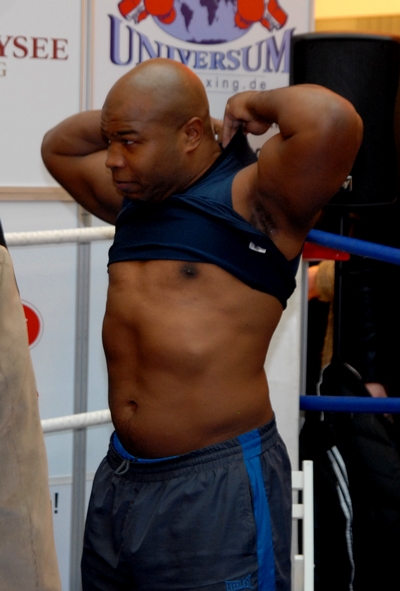 No chyba ten jeden facio to tu nie pasuje. Wyglada na otylego czlowieka w srednim wieku, ktory przyszedl do kliniki, aby zrzucic co najmniej 50 funtow! Doktor mu powiedzial, ze jego zdrowie jest wazne, takze nie moze byc az tak otyly. Takich pseudo-bokserow zawodowych nie powinna sie dopuszczac do walk, ani pokazywac rozebranych publicznie, bo oni osmieszaja nas sport!